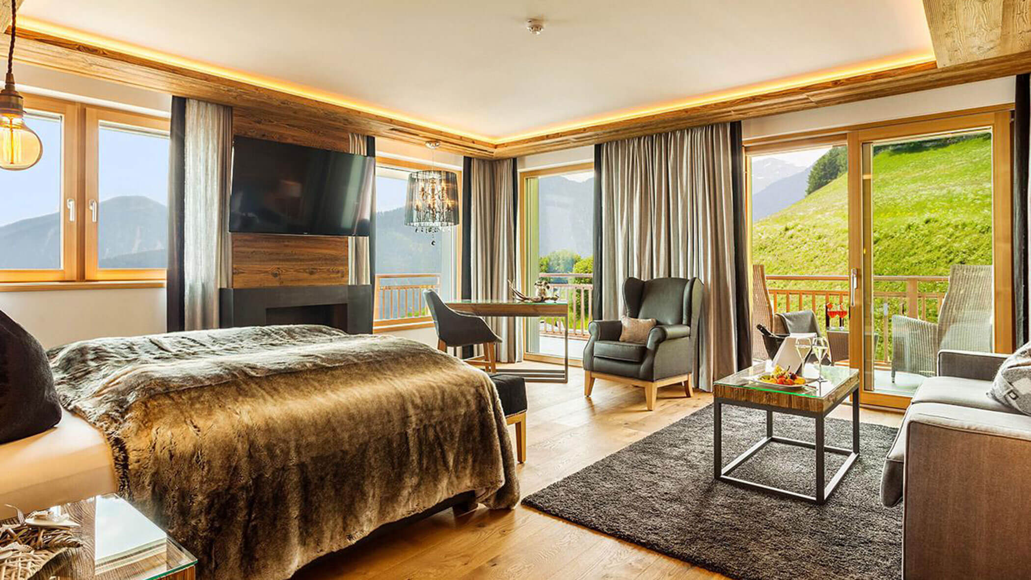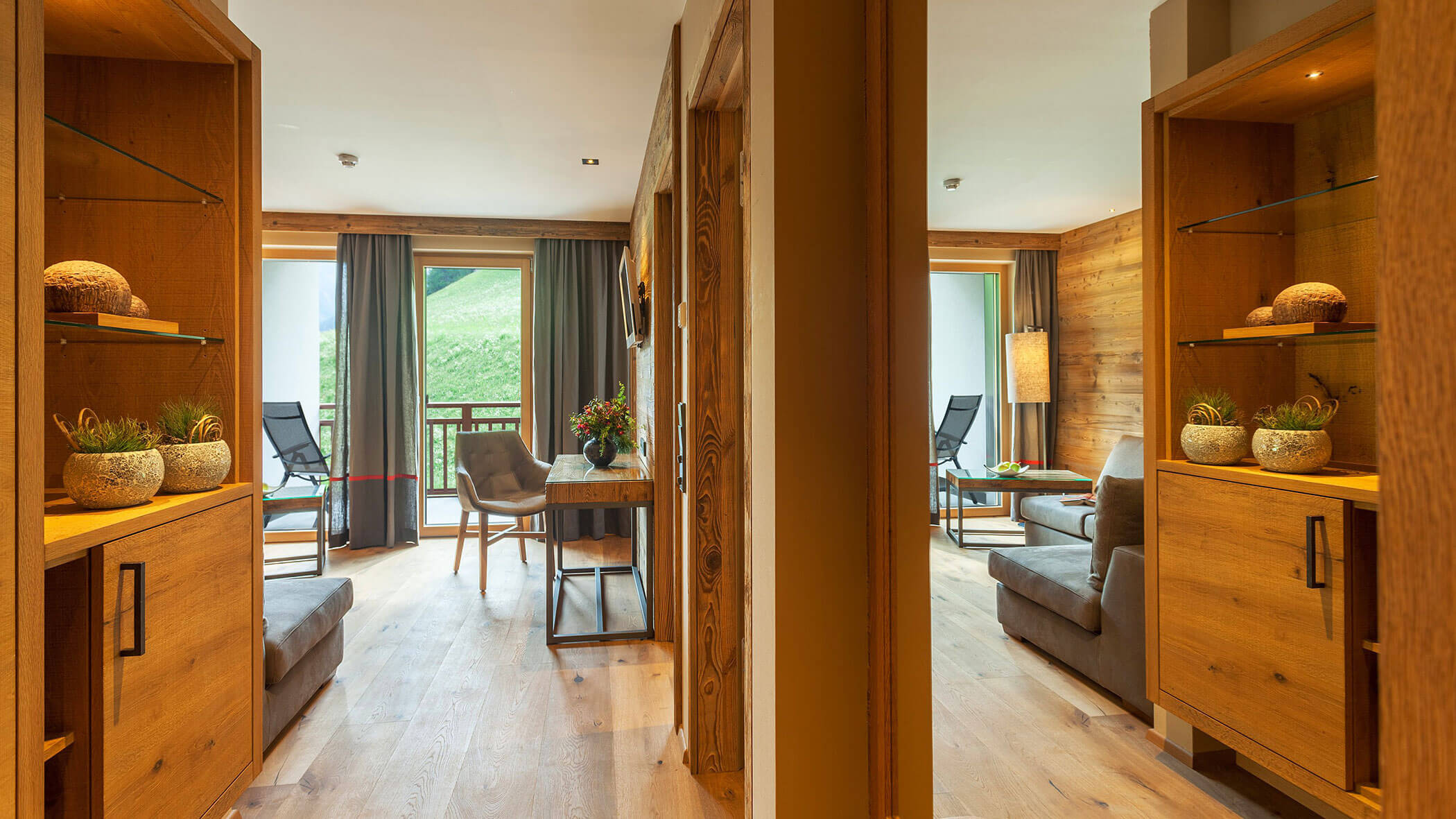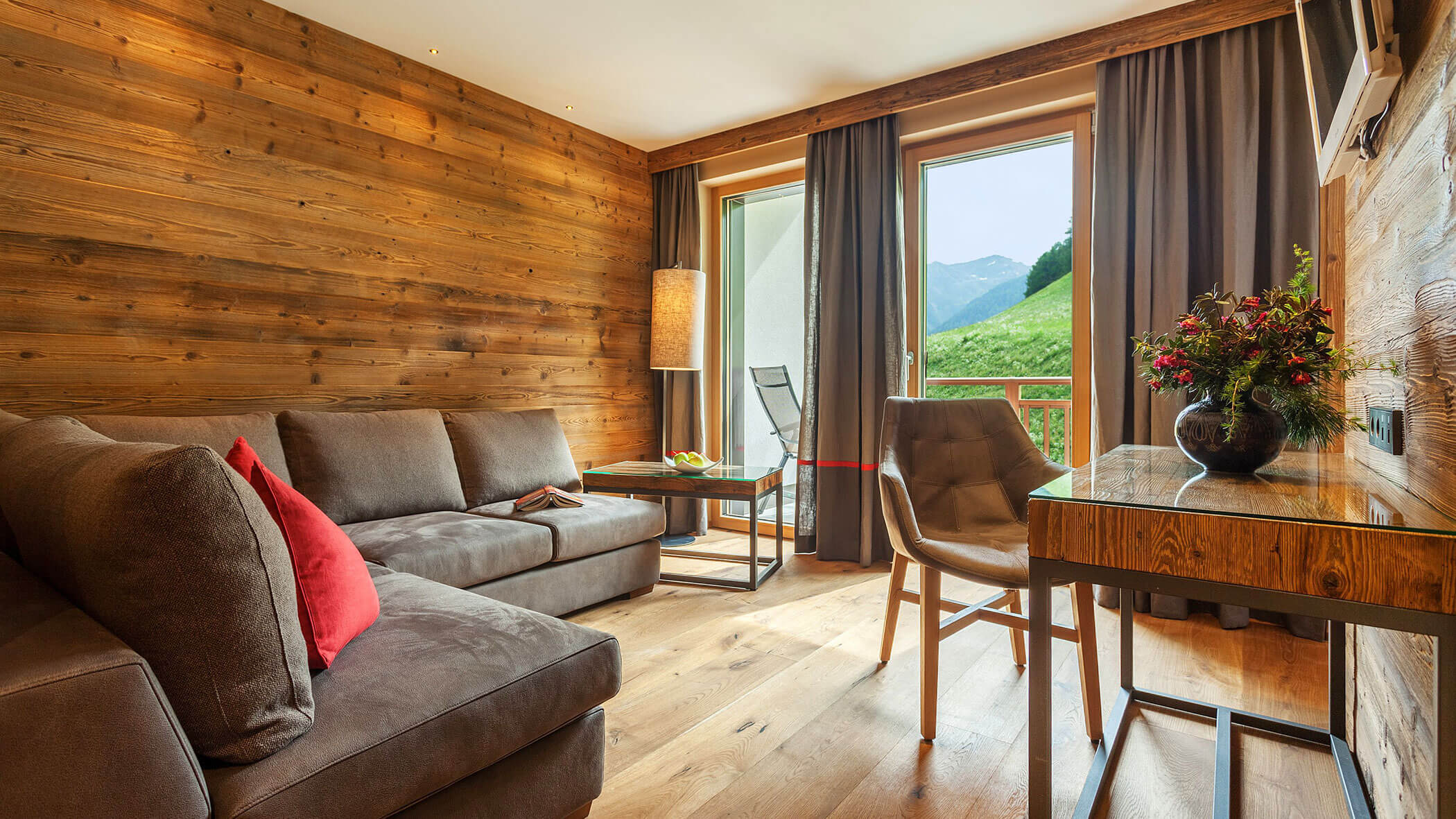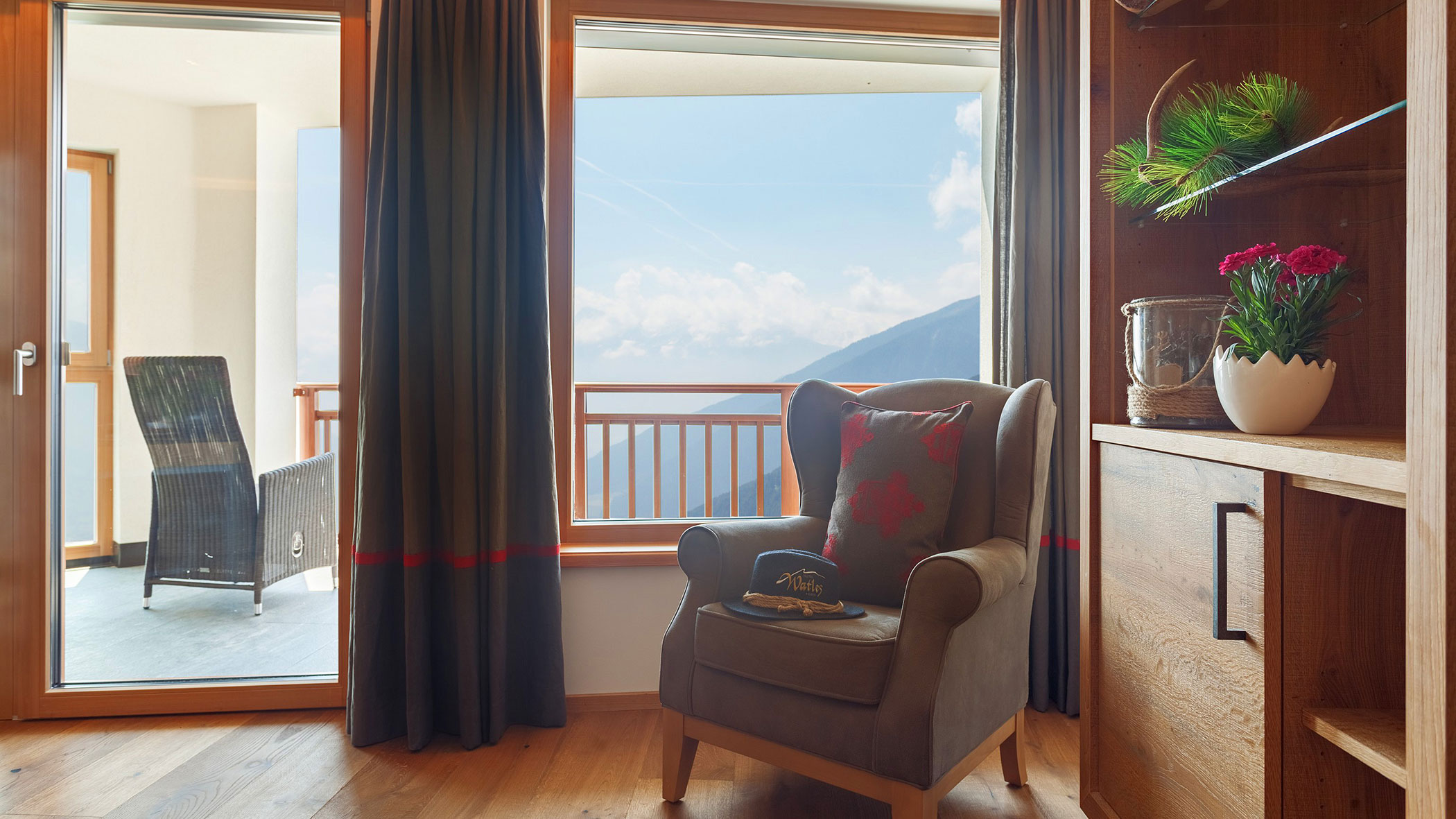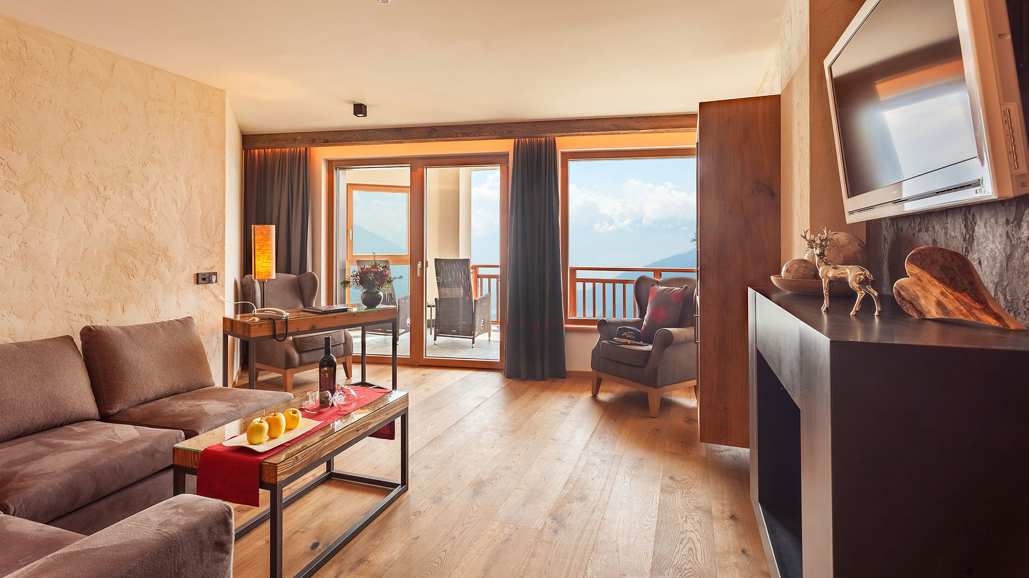 Wir waren in einer sehr komfortablen und geräumigen Junior Suite untergebracht. Als man uns an der Rezeption sagte, dass das Zimmer im Erdgeschoss sei, waren wir enttäuscht, aber als wir die Tür öffneten, erlebten wir eine wunderbare Überraschung, denn stattdessen befand sich der große Balkon an der Bergwand, mit Blick auf das Tal und die gegenüberliegenden Berge. Atemberaubende Aussicht.