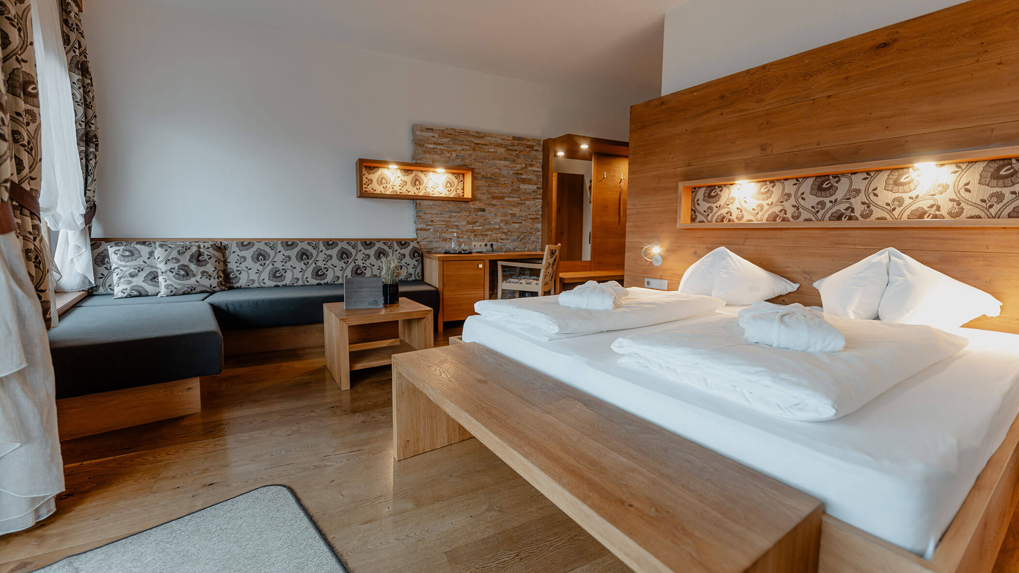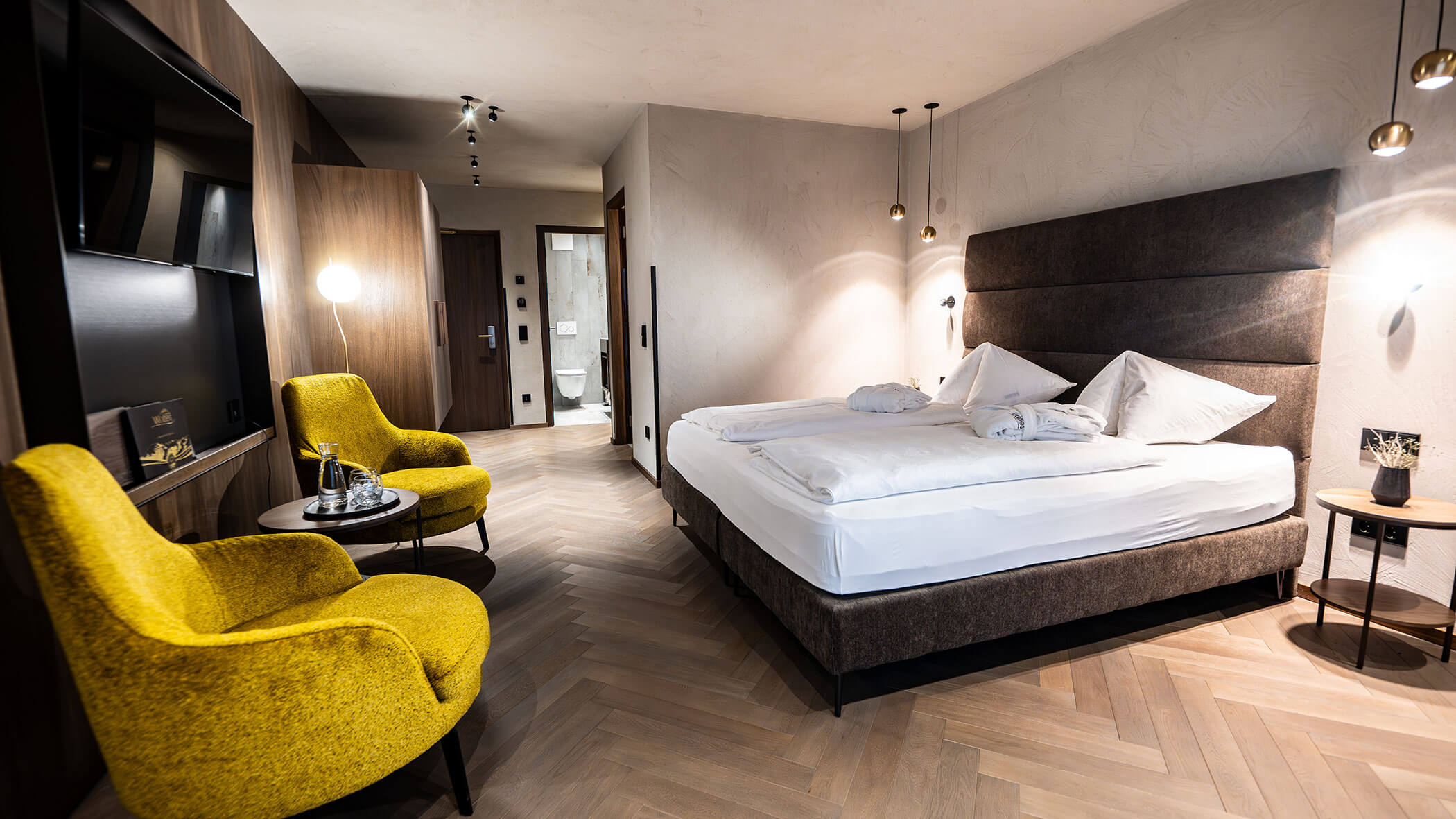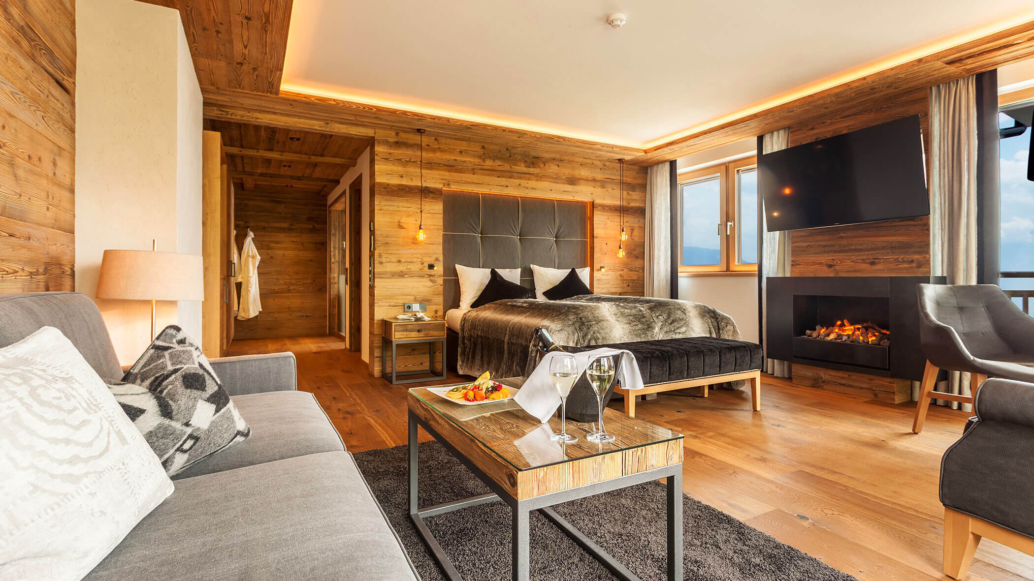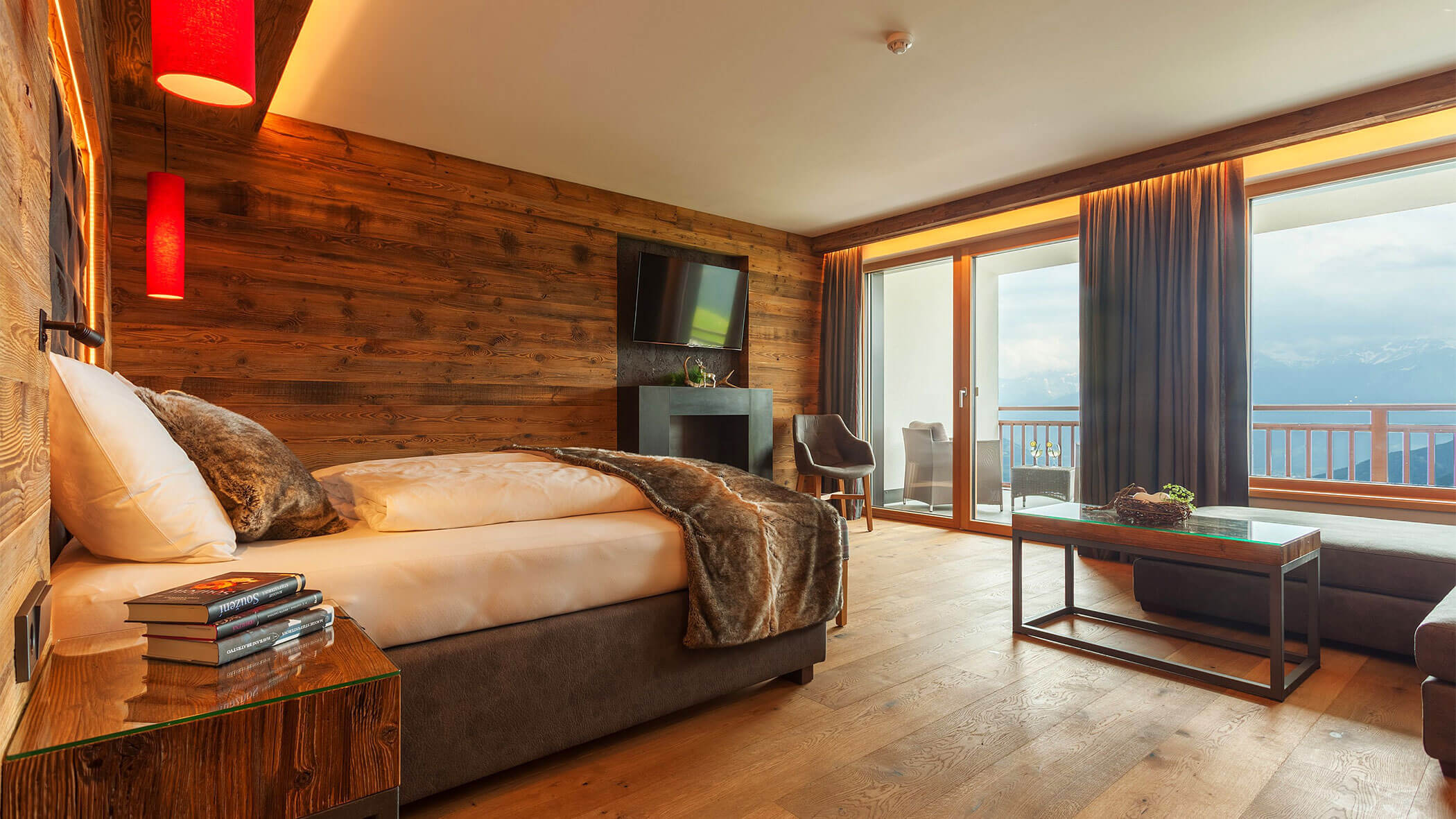 Wir waren in einer sehr komfortablen und geräumigen Junior Suite untergebracht. Als man uns an der Rezeption sagte, dass das Zimmer im Erdgeschoss sei, waren wir enttäuscht, aber als wir die Tür öffneten, erlebten wir eine wunderbare Überraschung, denn stattdessen befand sich der große Balkon an der Bergwand, mit Blick auf das Tal und die gegenüberliegenden Berge. Atemberaubende Aussicht.