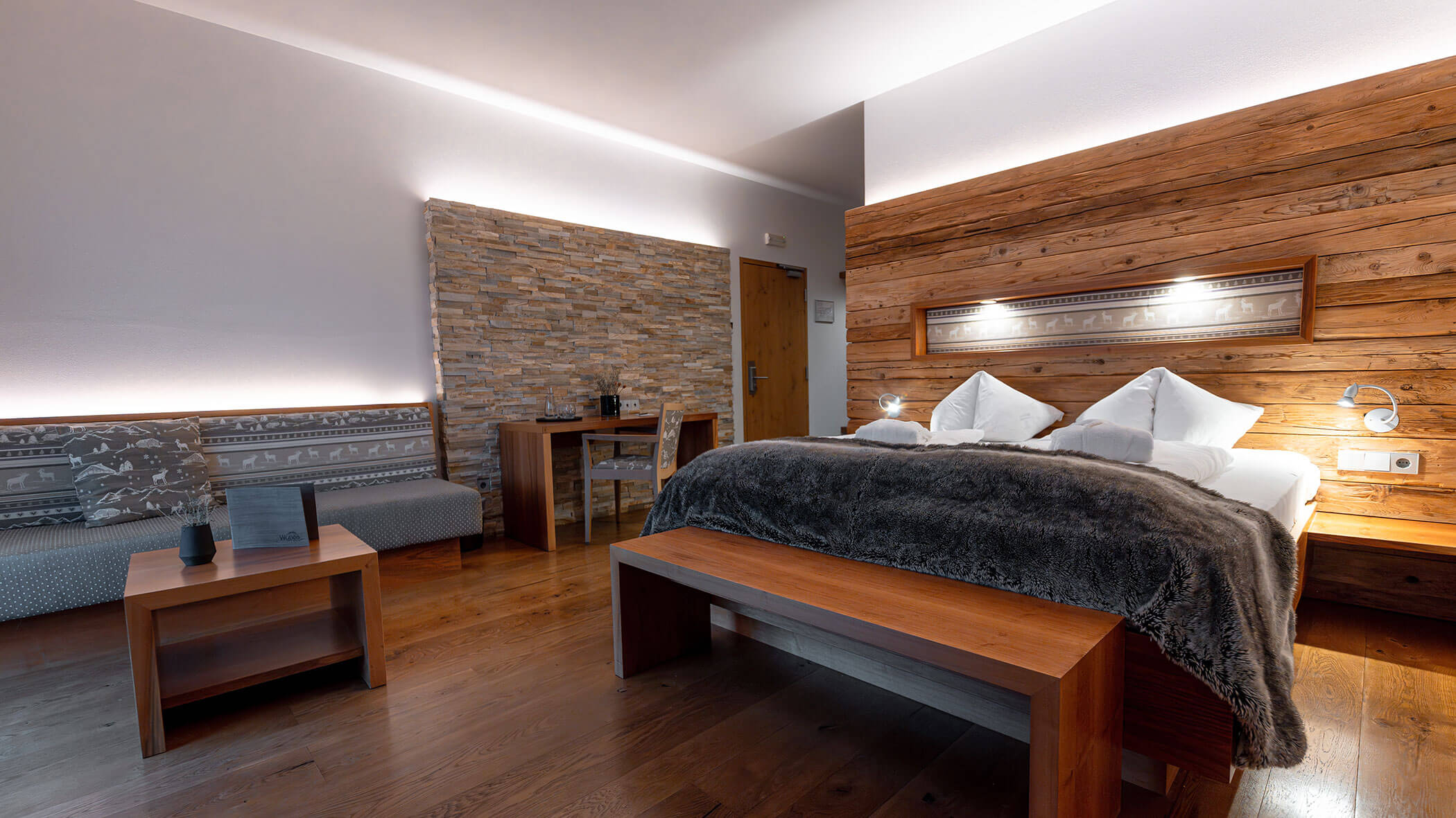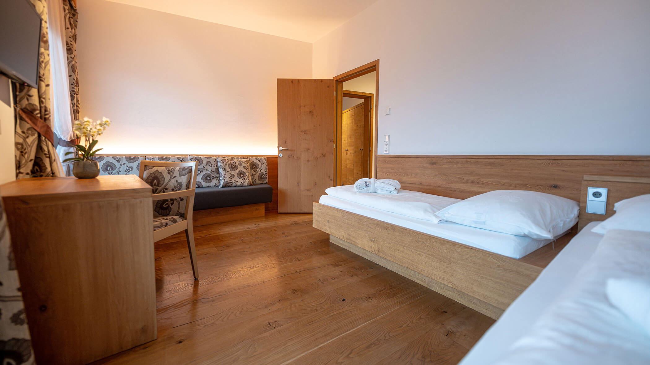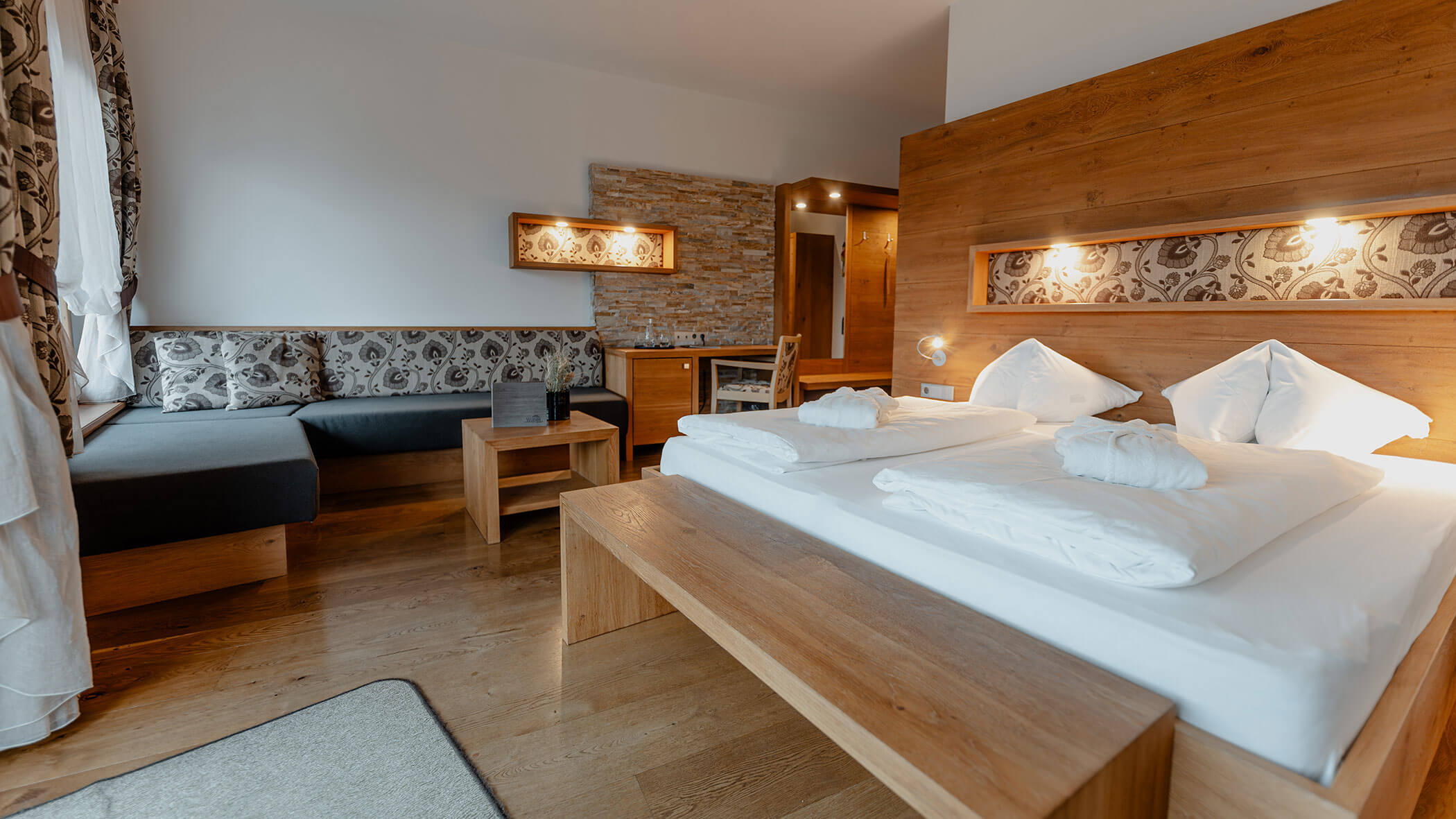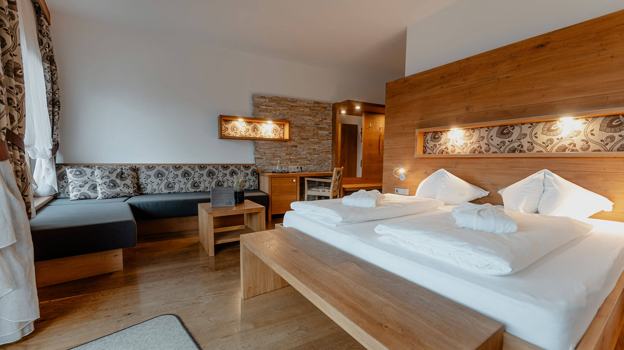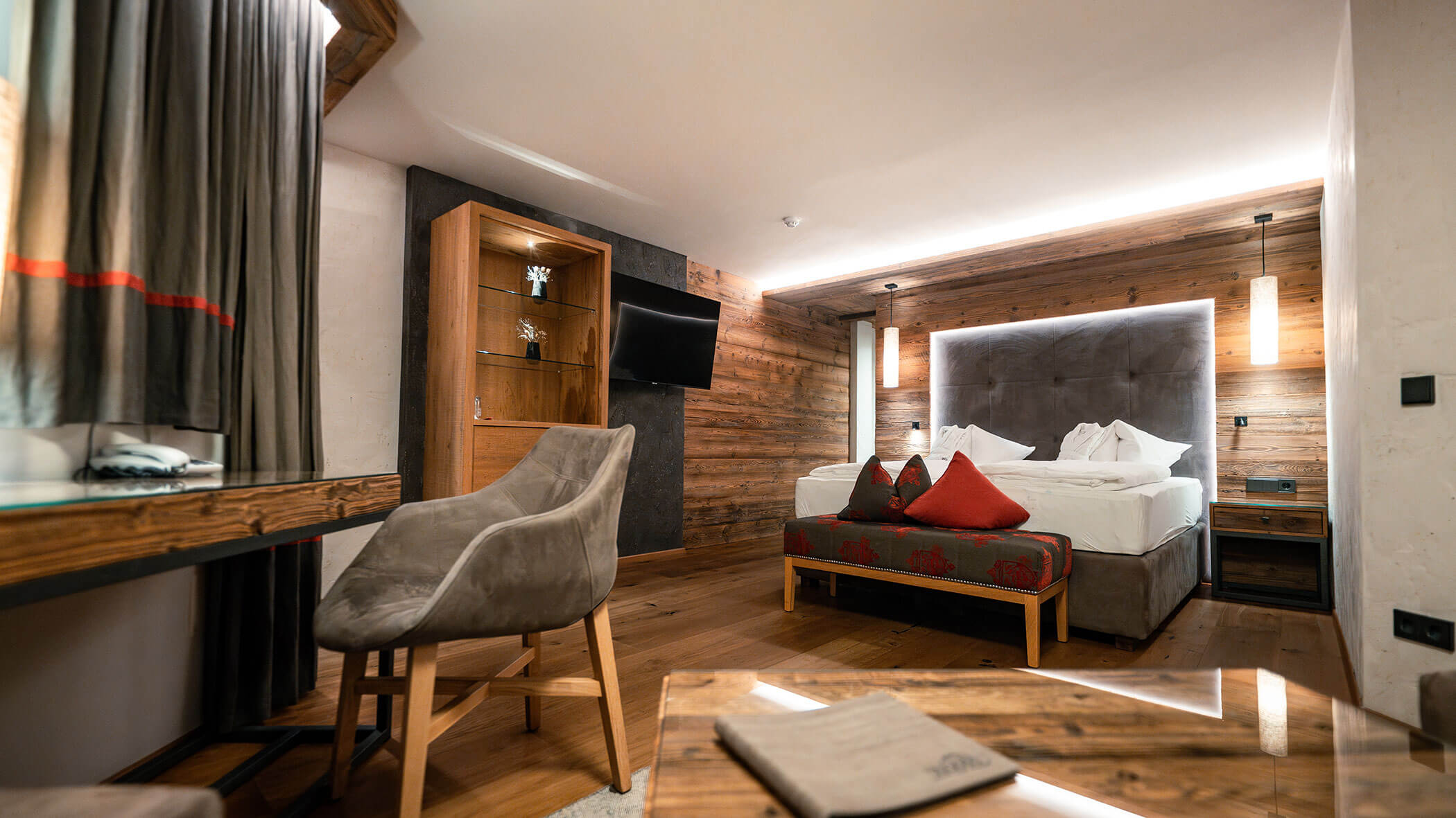 Wir waren in einer sehr komfortablen und geräumigen Junior Suite untergebracht. Als man uns an der Rezeption sagte, dass das Zimmer im Erdgeschoss sei, waren wir enttäuscht, aber als wir die Tür öffneten, erlebten wir eine wunderbare Überraschung, denn stattdessen befand sich der große Balkon an der Bergwand, mit Blick auf das Tal und die gegenüberliegenden Berge. Atemberaubende Aussicht.