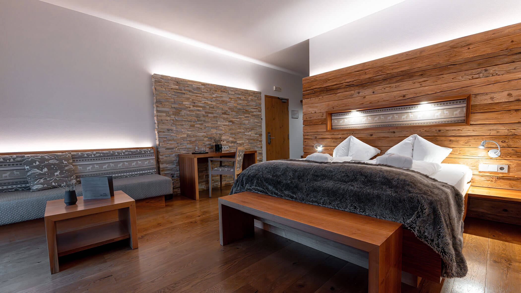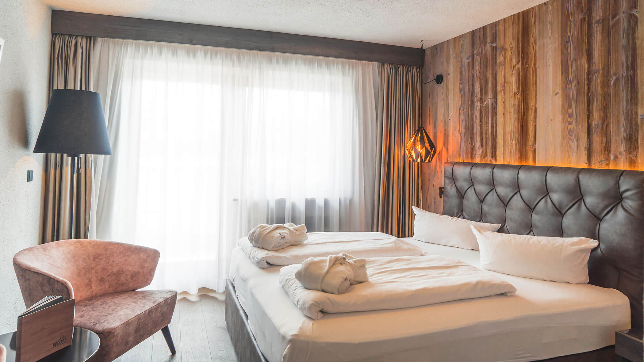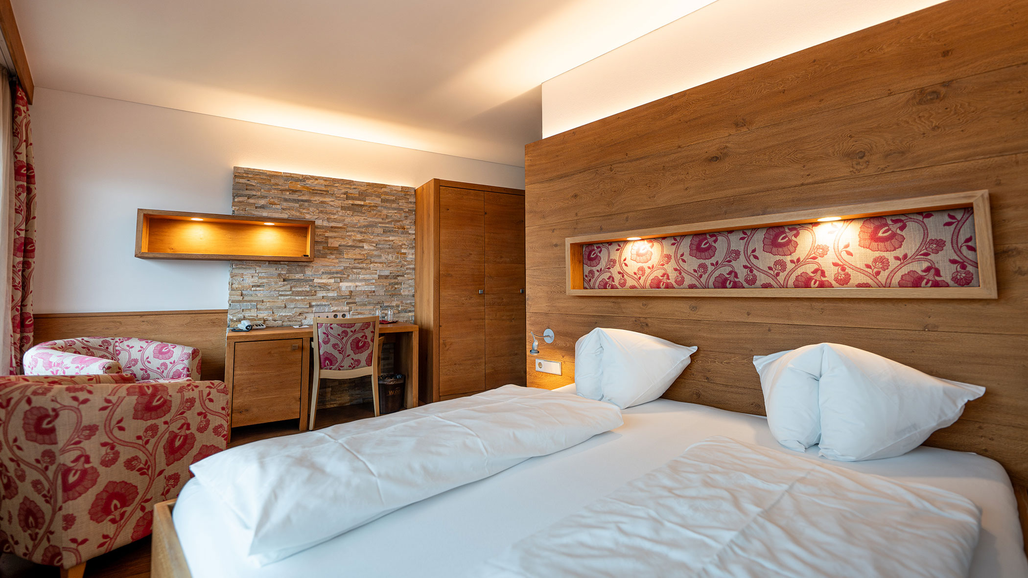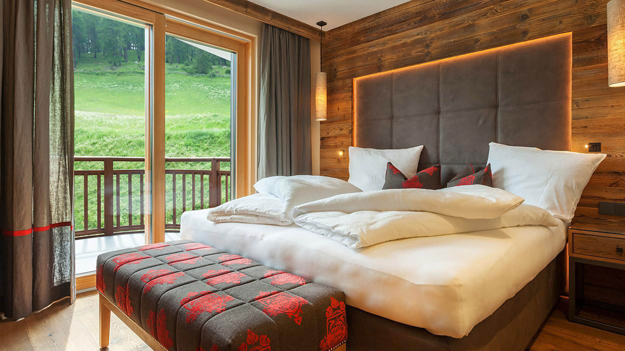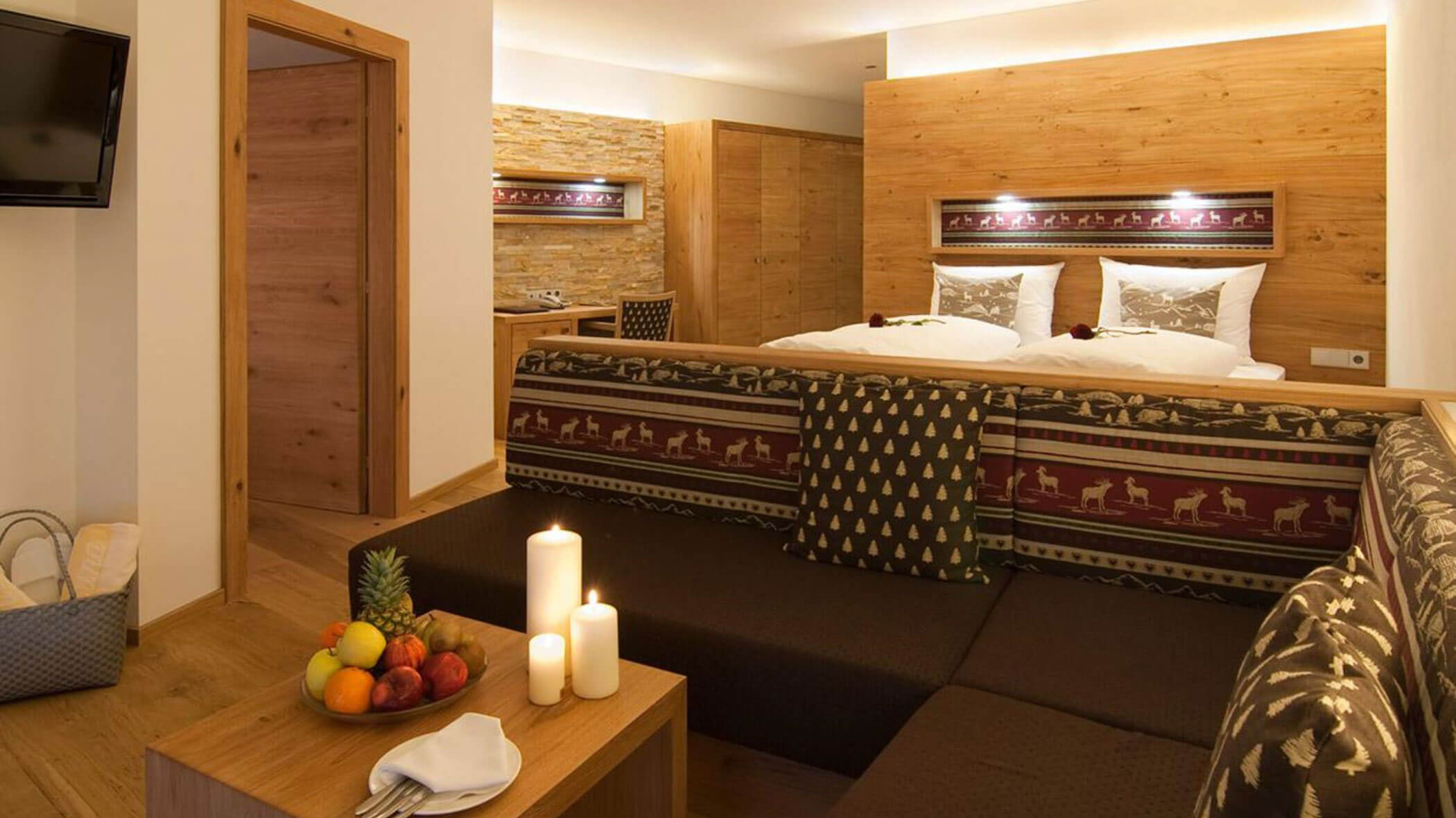 Wir waren in einer sehr komfortablen und geräumigen Junior Suite untergebracht. Als man uns an der Rezeption sagte, dass das Zimmer im Erdgeschoss sei, waren wir enttäuscht, aber als wir die Tür öffneten, erlebten wir eine wunderbare Überraschung, denn stattdessen befand sich der große Balkon an der Bergwand, mit Blick auf das Tal und die gegenüberliegenden Berge. Atemberaubende Aussicht.