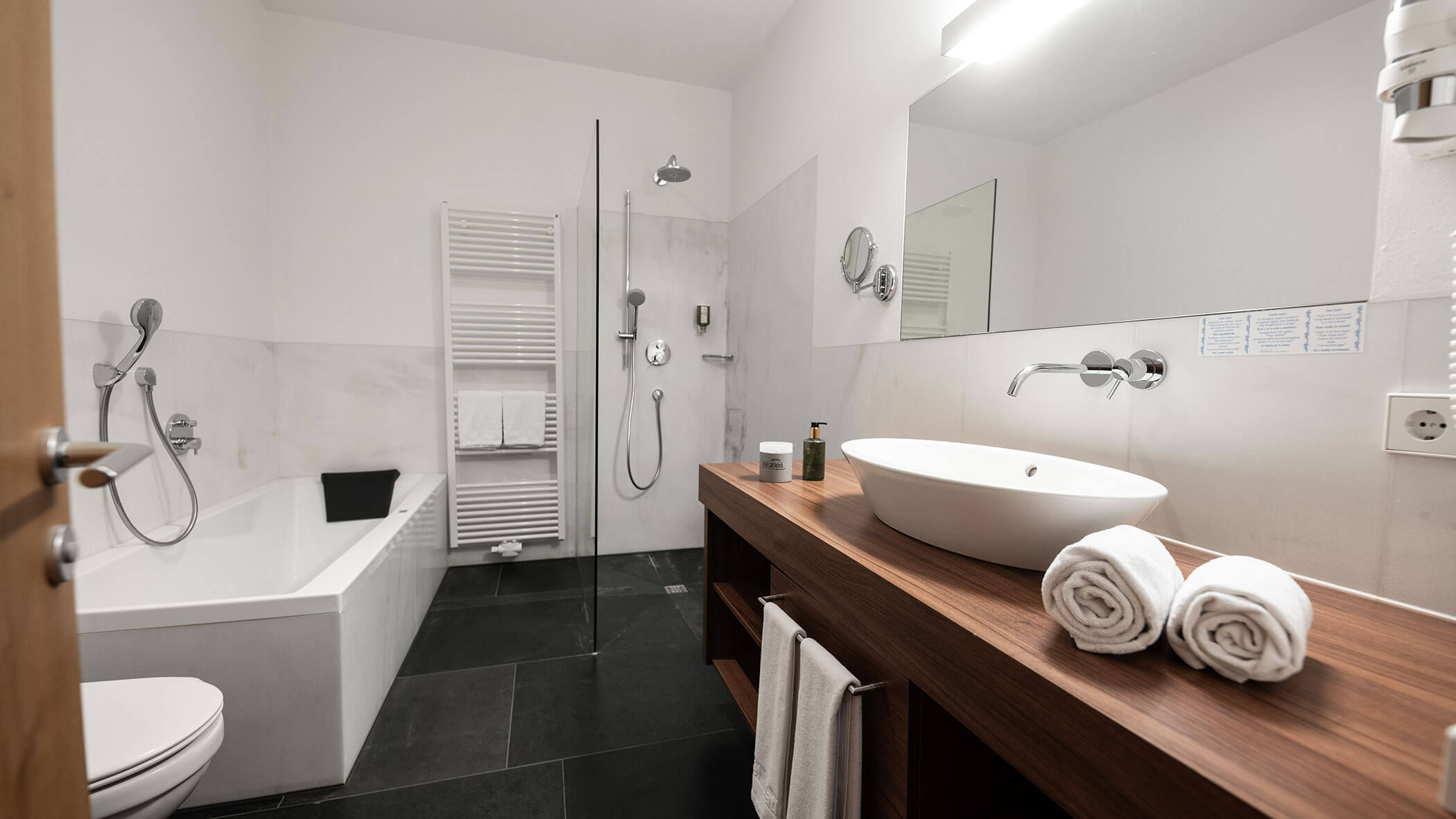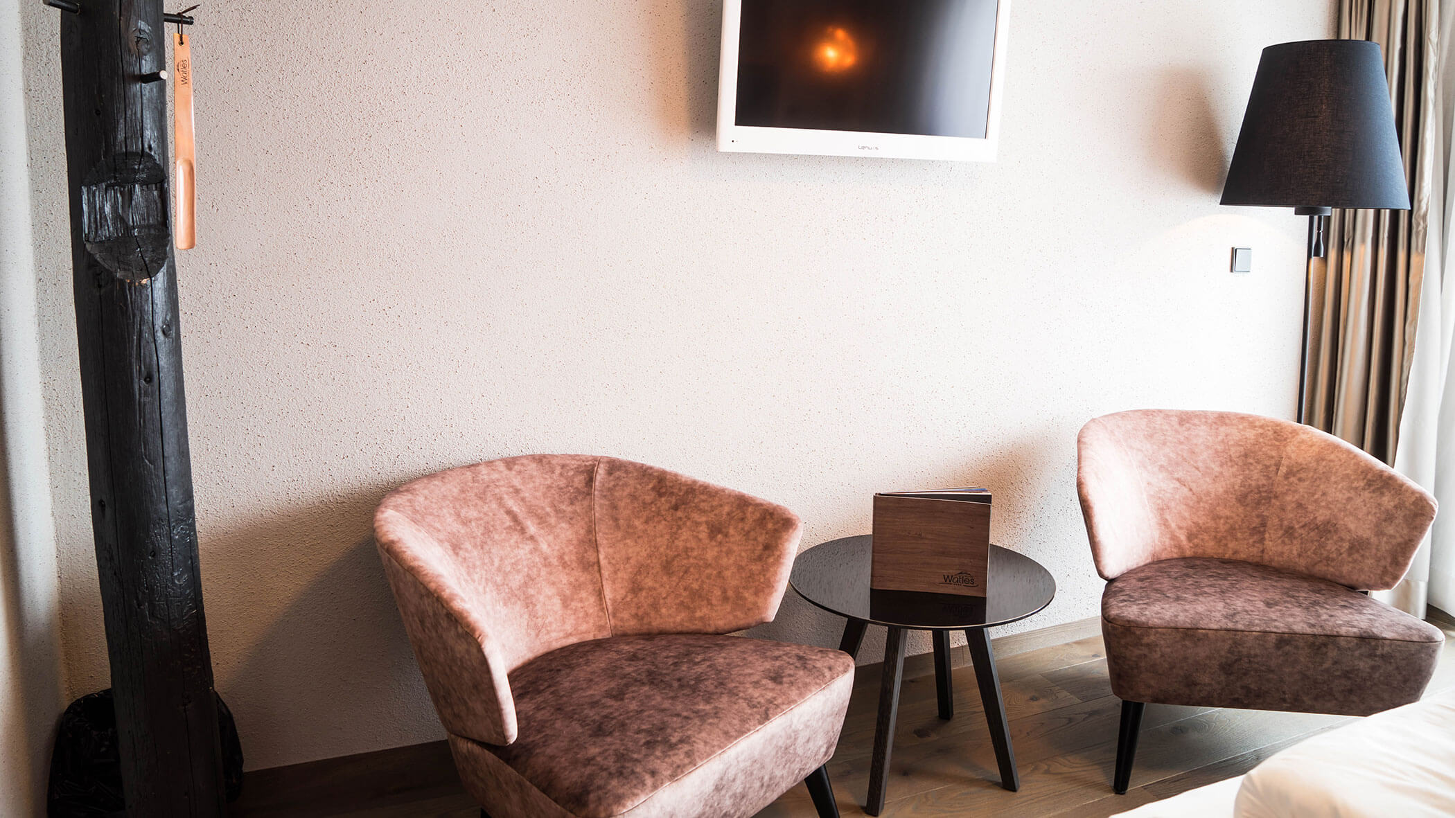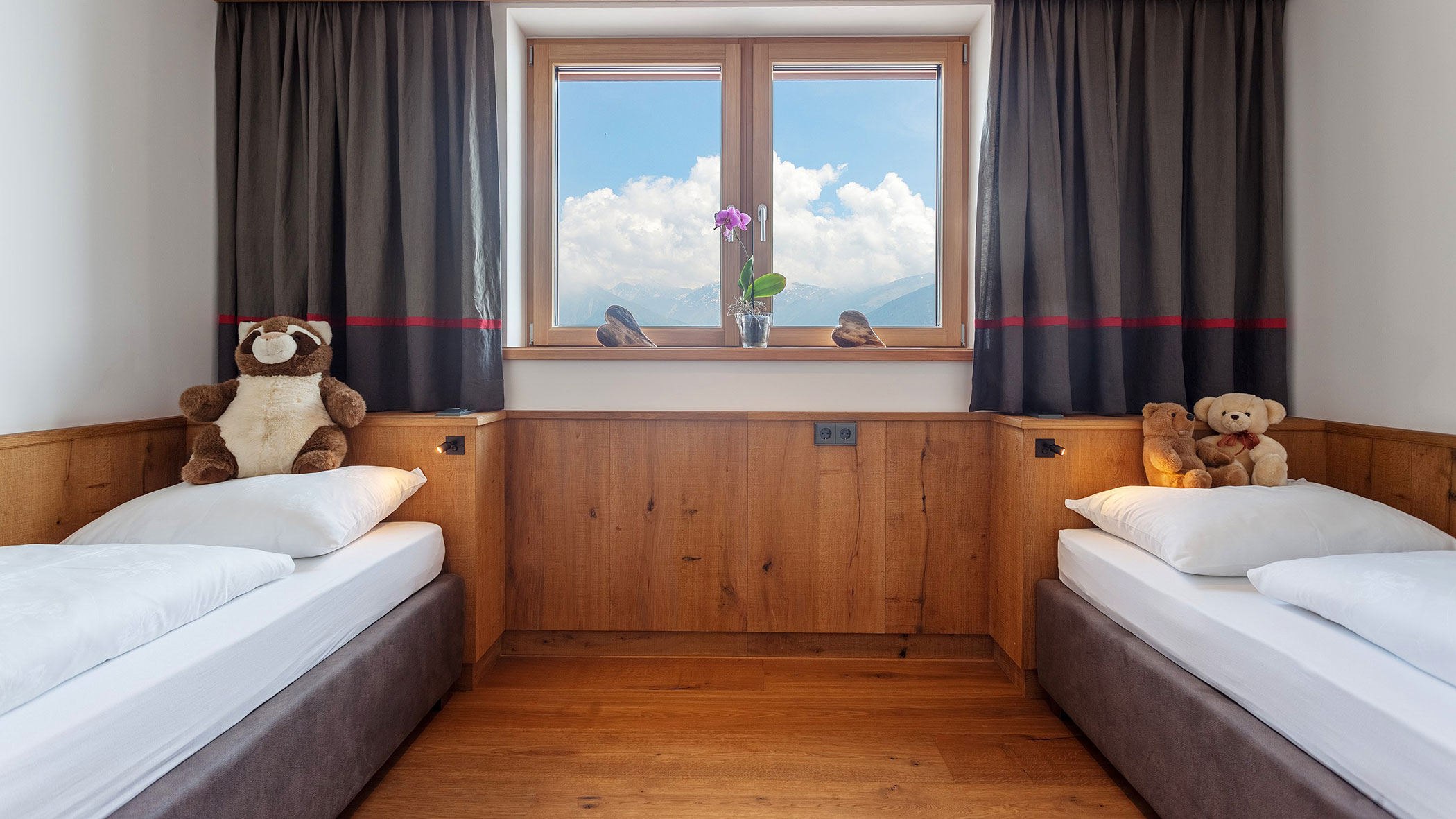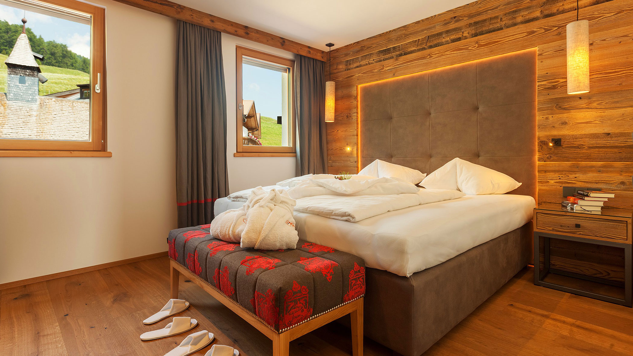 Wir waren in einer sehr komfortablen und geräumigen Junior Suite untergebracht. Als man uns an der Rezeption sagte, dass das Zimmer im Erdgeschoss sei, waren wir enttäuscht, aber als wir die Tür öffneten, erlebten wir eine wunderbare Überraschung, denn stattdessen befand sich der große Balkon an der Bergwand, mit Blick auf das Tal und die gegenüberliegenden Berge. Atemberaubende Aussicht.