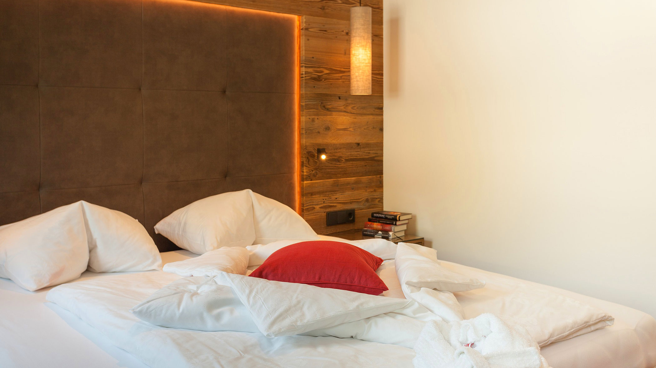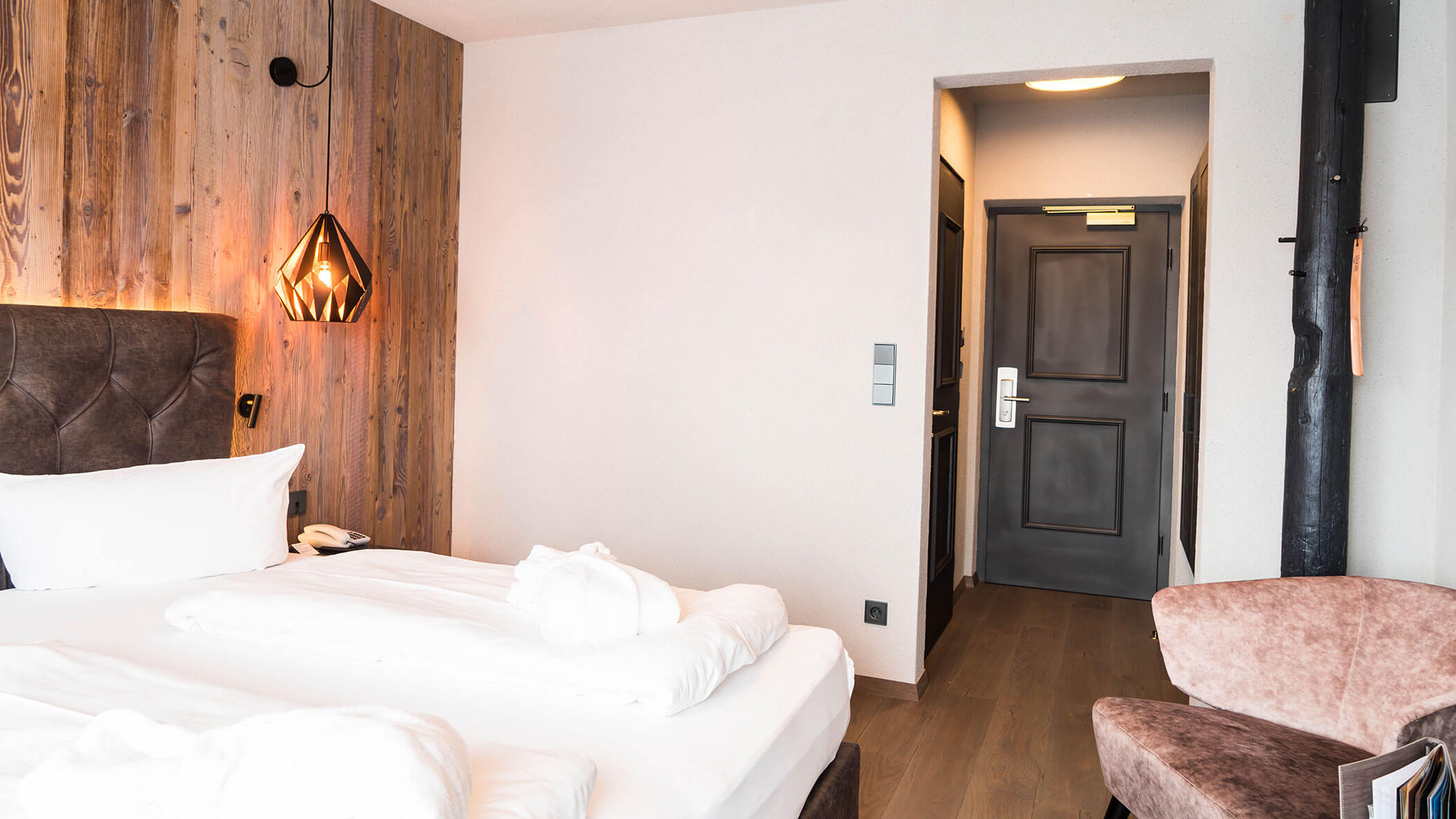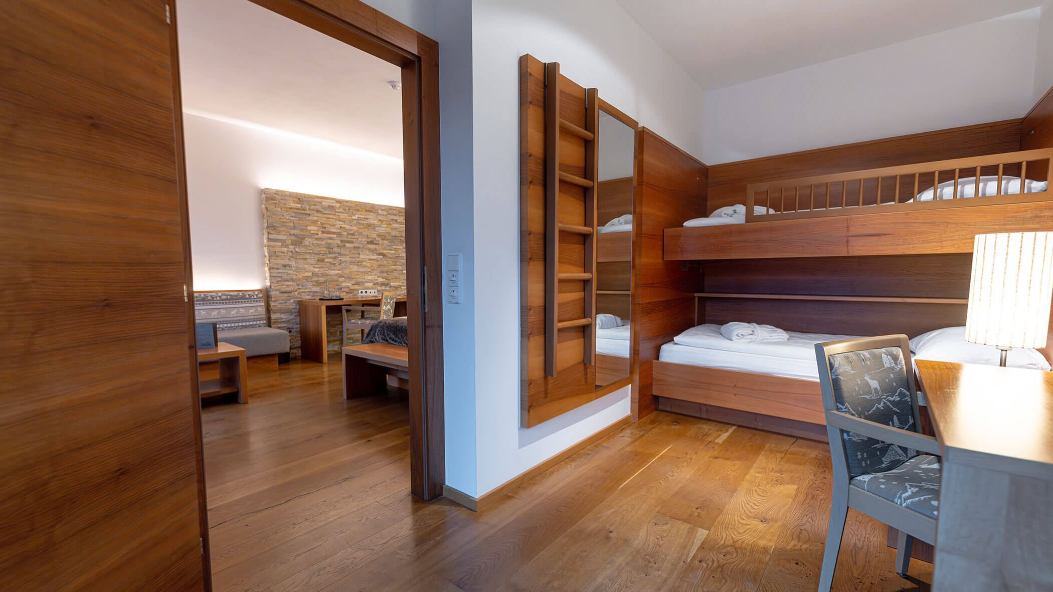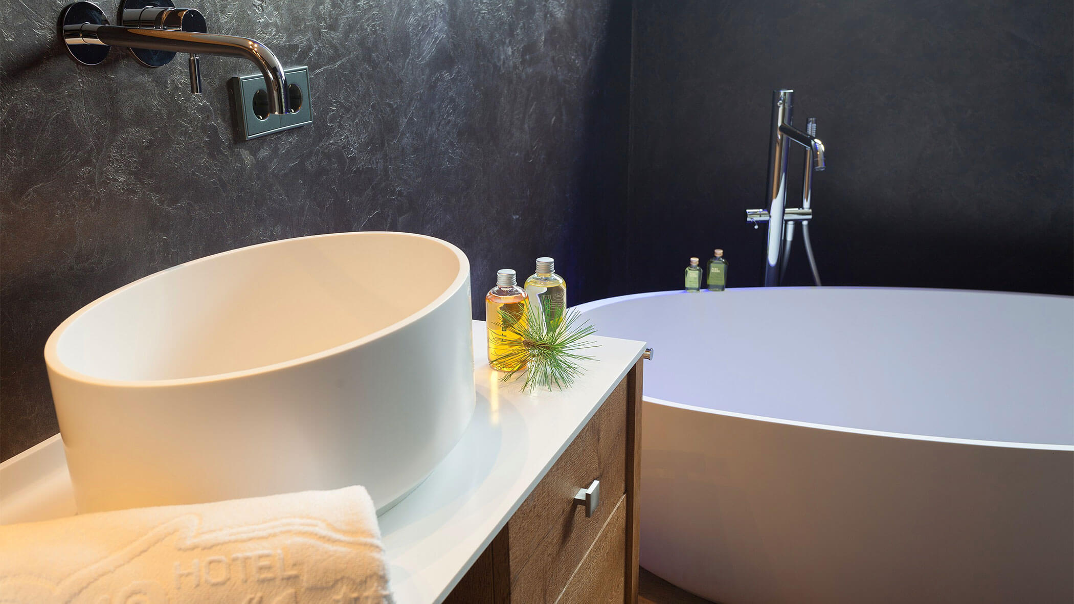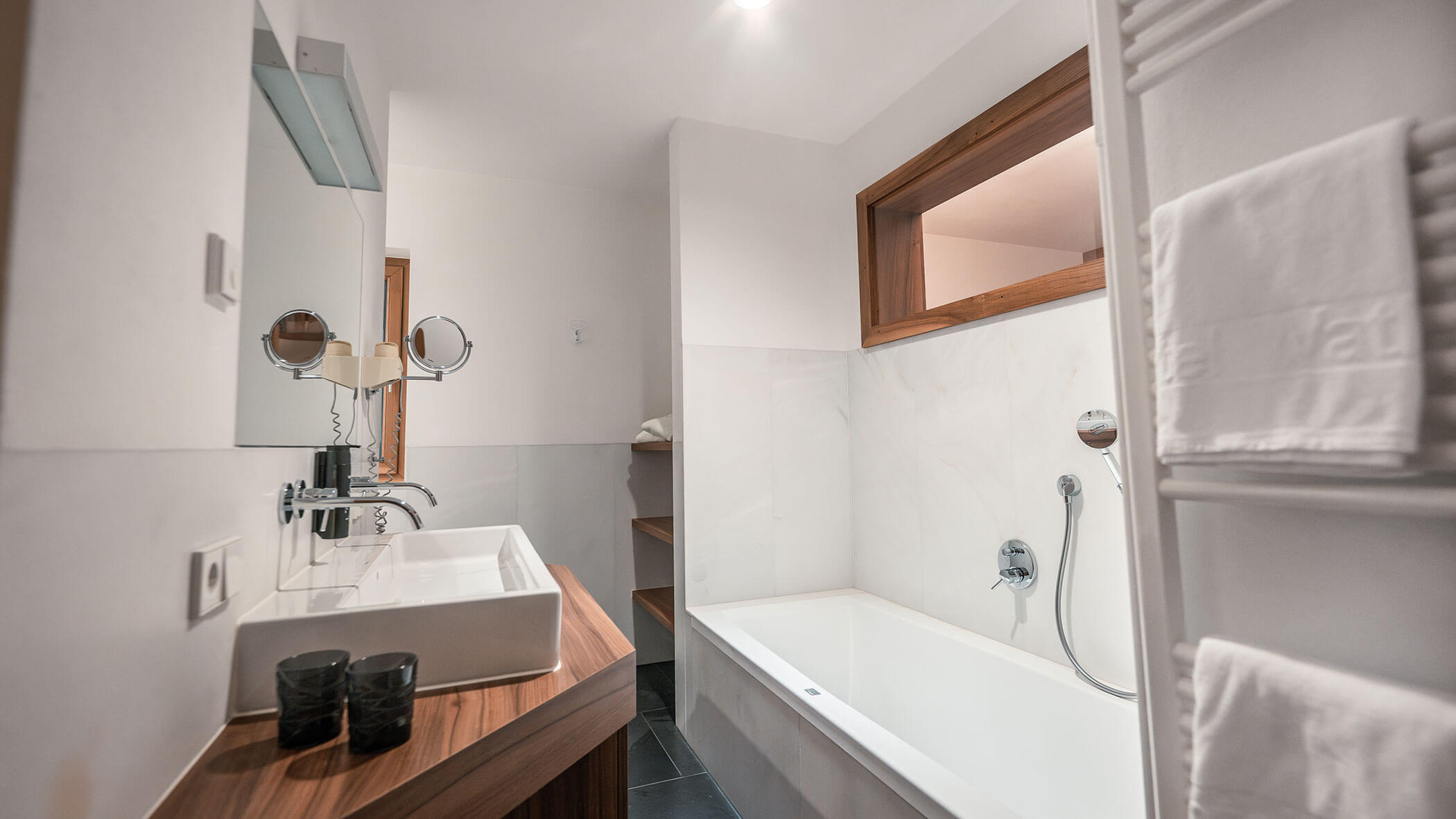 Wir waren in einer sehr komfortablen und geräumigen Junior Suite untergebracht. Als man uns an der Rezeption sagte, dass das Zimmer im Erdgeschoss sei, waren wir enttäuscht, aber als wir die Tür öffneten, erlebten wir eine wunderbare Überraschung, denn stattdessen befand sich der große Balkon an der Bergwand, mit Blick auf das Tal und die gegenüberliegenden Berge. Atemberaubende Aussicht.