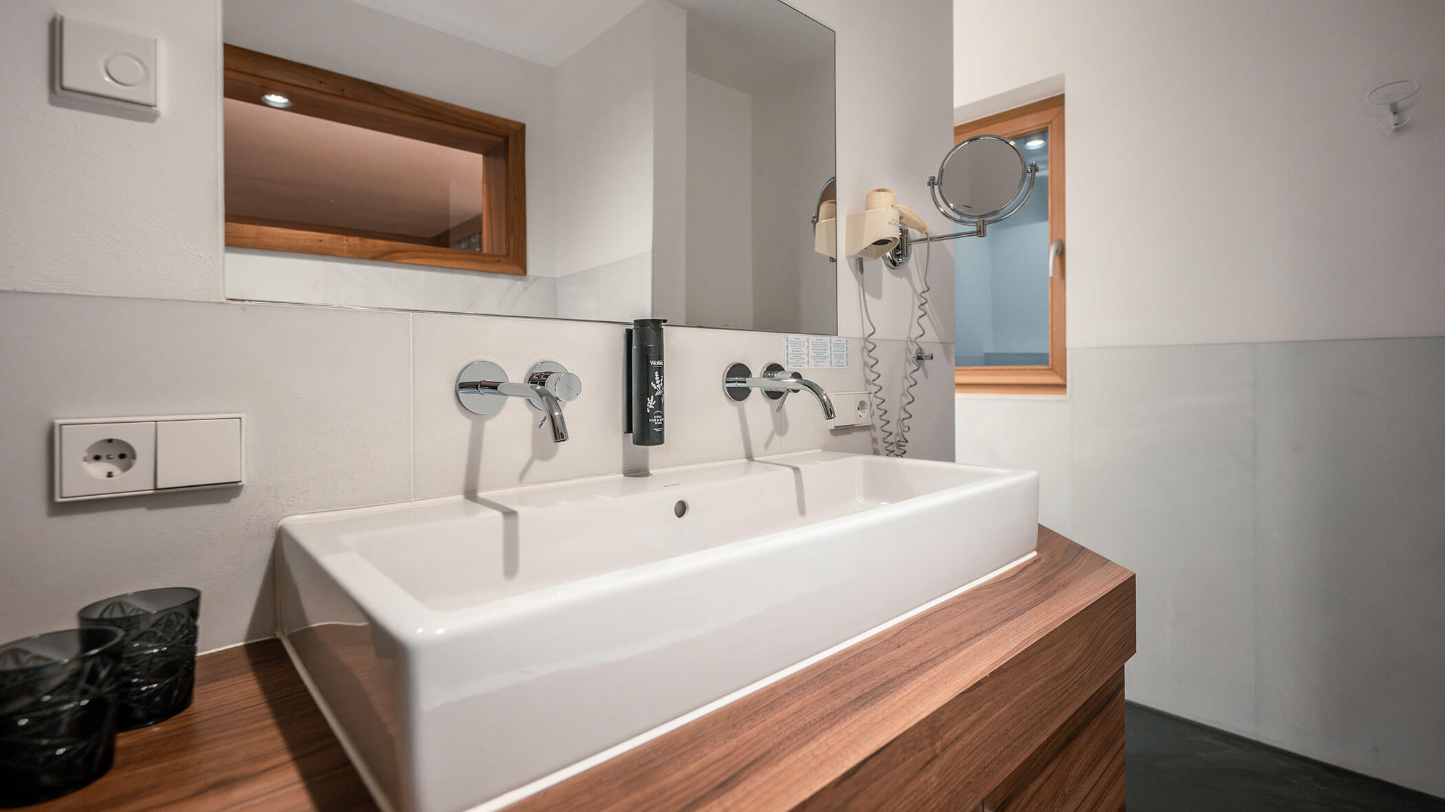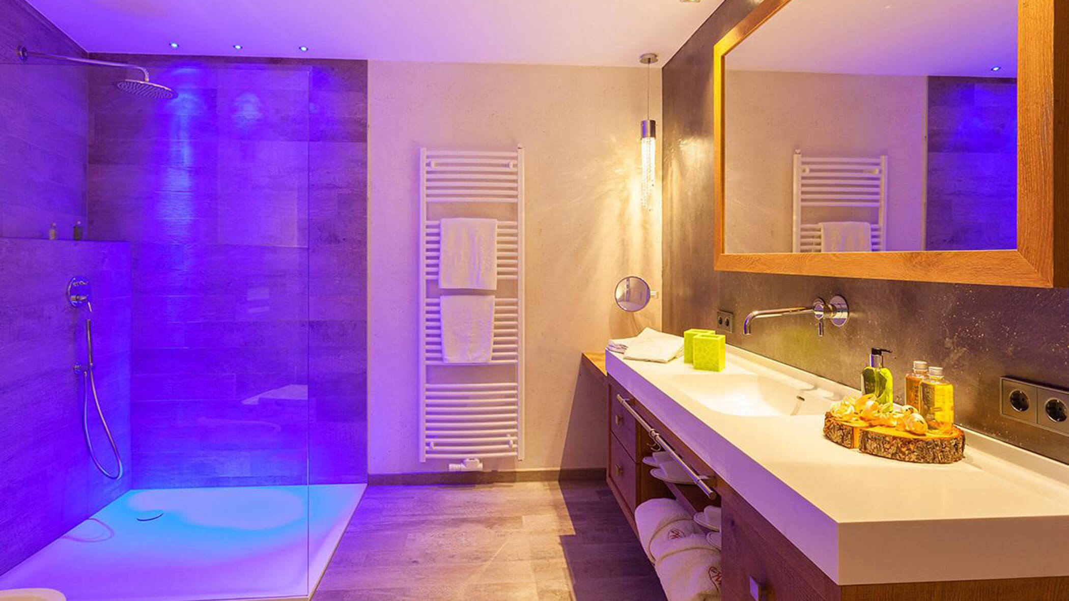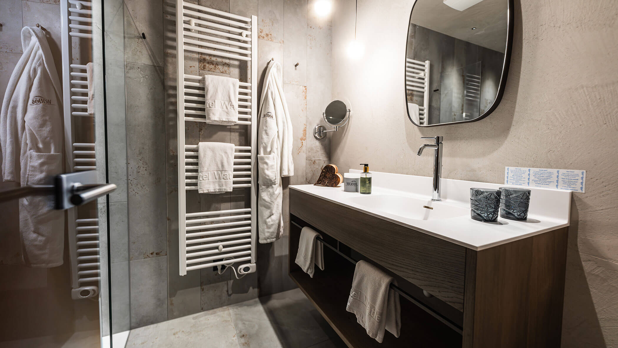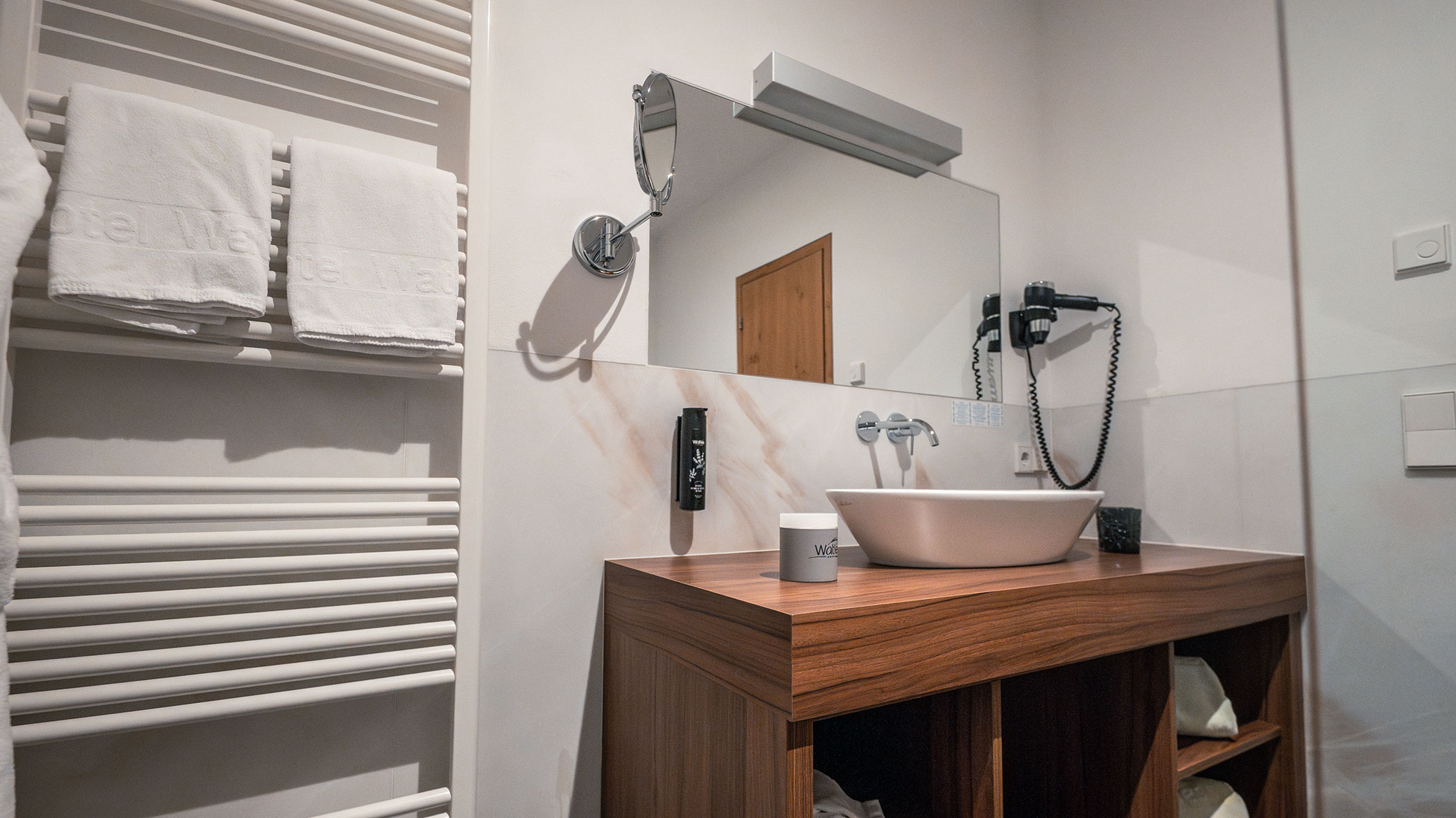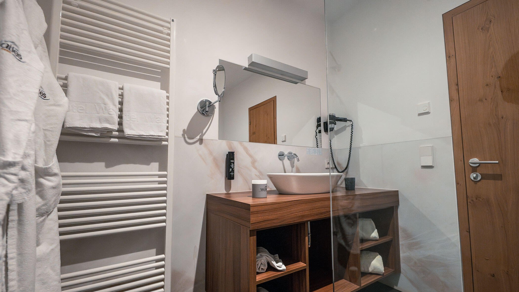 Wir waren in einer sehr komfortablen und geräumigen Junior Suite untergebracht. Als man uns an der Rezeption sagte, dass das Zimmer im Erdgeschoss sei, waren wir enttäuscht, aber als wir die Tür öffneten, erlebten wir eine wunderbare Überraschung, denn stattdessen befand sich der große Balkon an der Bergwand, mit Blick auf das Tal und die gegenüberliegenden Berge. Atemberaubende Aussicht.