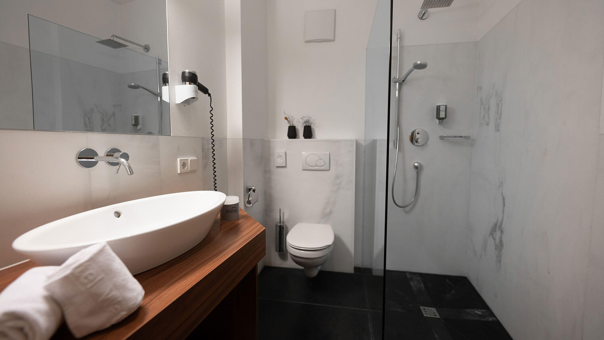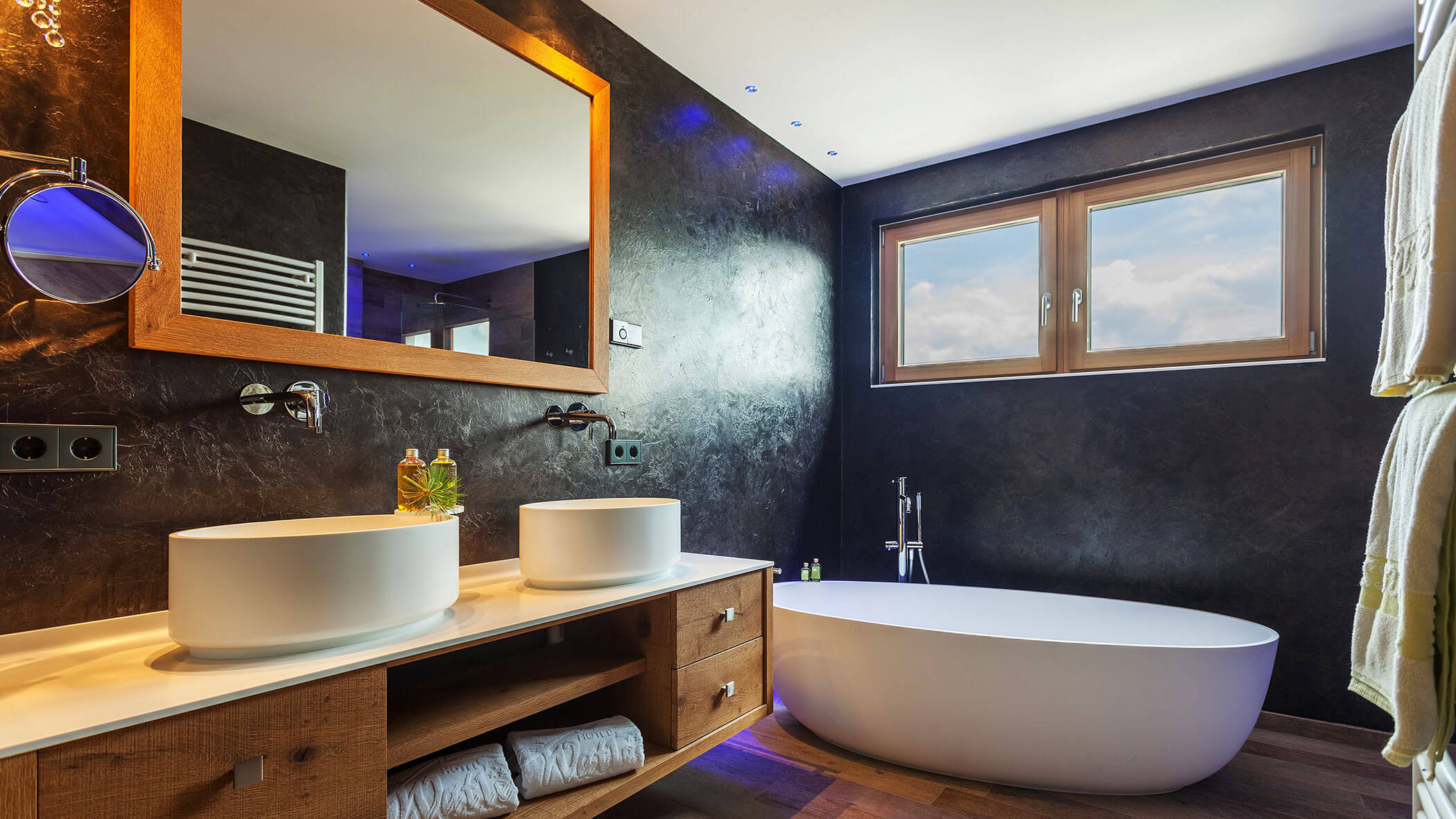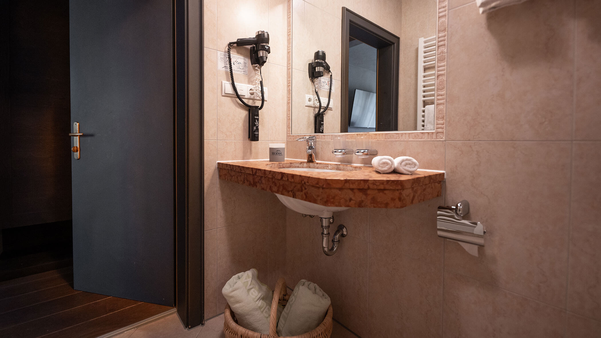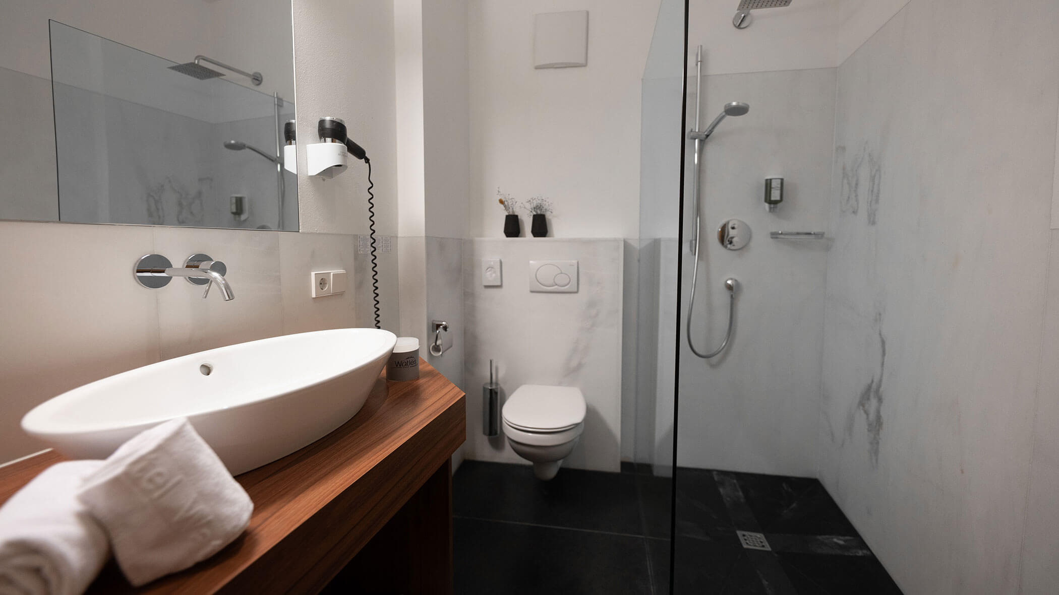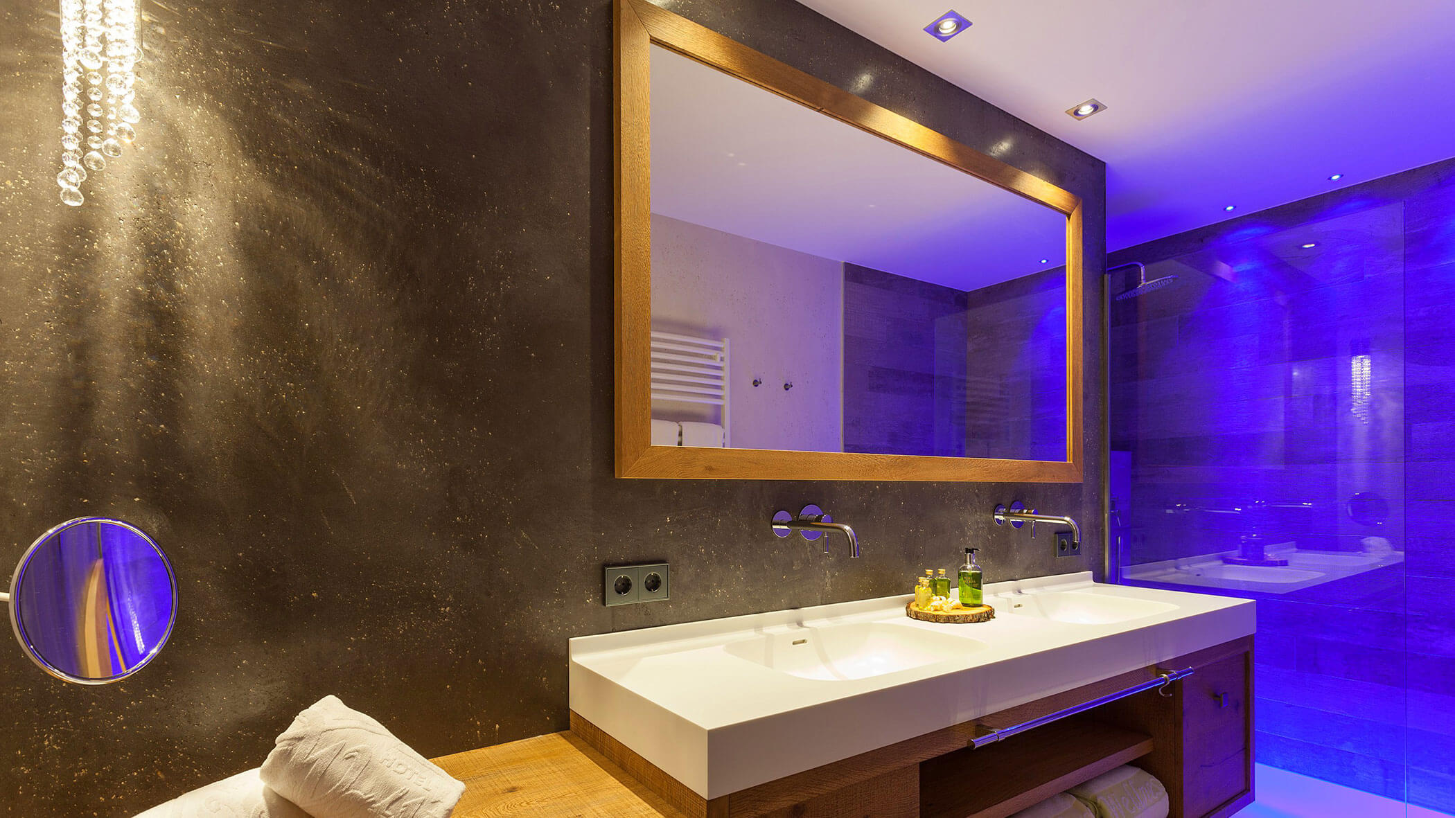 Wir waren in einer sehr komfortablen und geräumigen Junior Suite untergebracht. Als man uns an der Rezeption sagte, dass das Zimmer im Erdgeschoss sei, waren wir enttäuscht, aber als wir die Tür öffneten, erlebten wir eine wunderbare Überraschung, denn stattdessen befand sich der große Balkon an der Bergwand, mit Blick auf das Tal und die gegenüberliegenden Berge. Atemberaubende Aussicht.